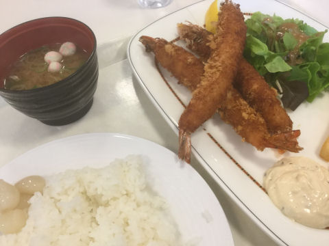 いつも通りエビフライ定食を食べました.相変わらず有頭でビッグです.