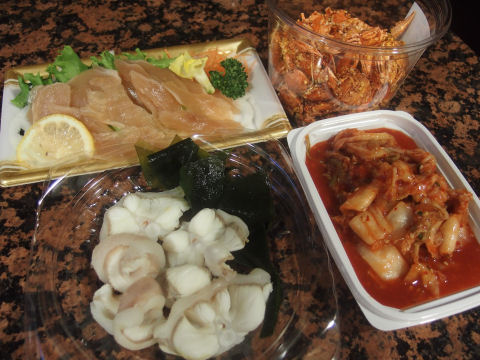 近くのスーパーで夕食を買ってきました.黒どり生ハム,玉子ガニ,フカ湯引き,博多ねぎ味噌キムチと珍しいものばかり売っていました.