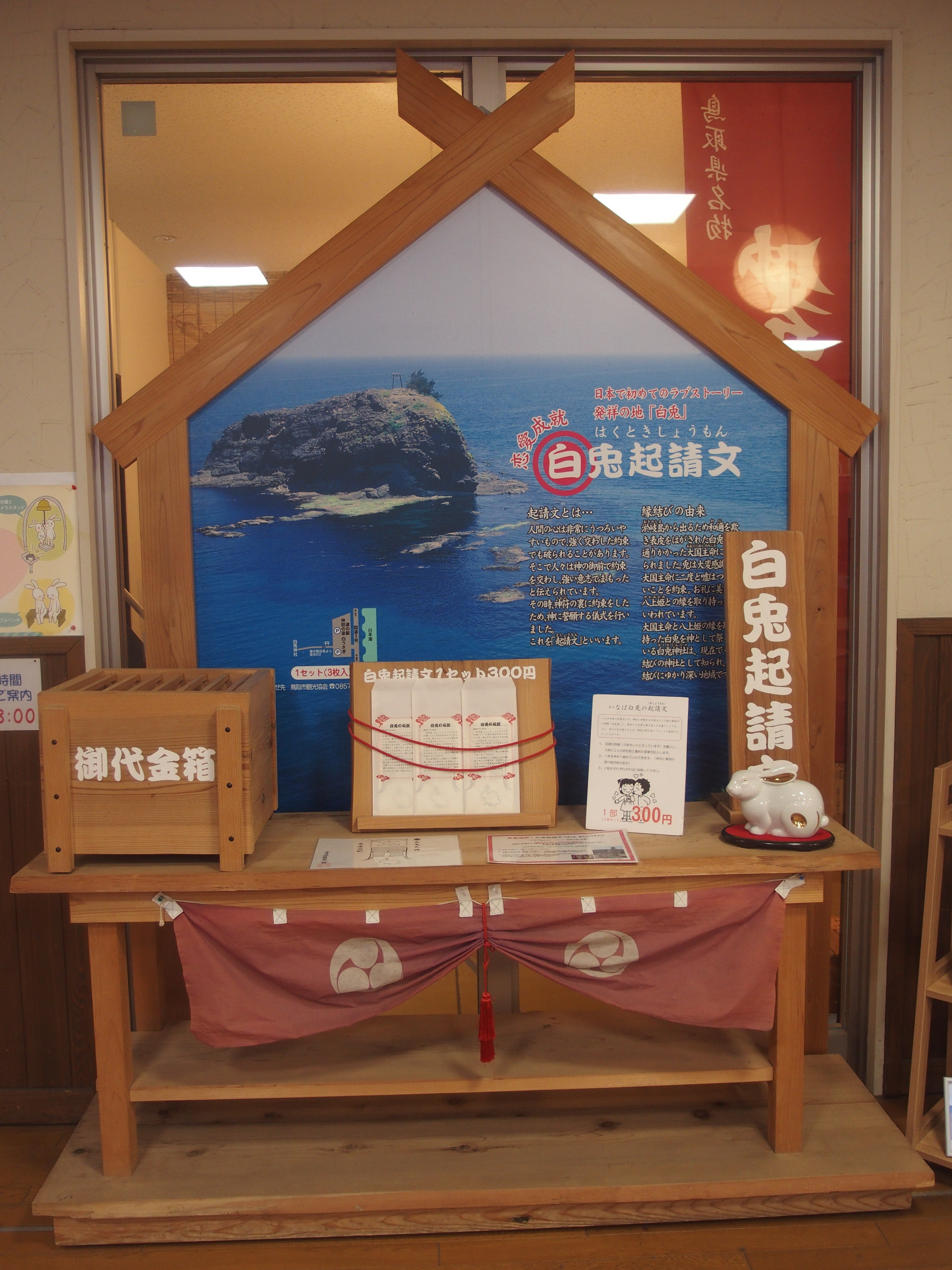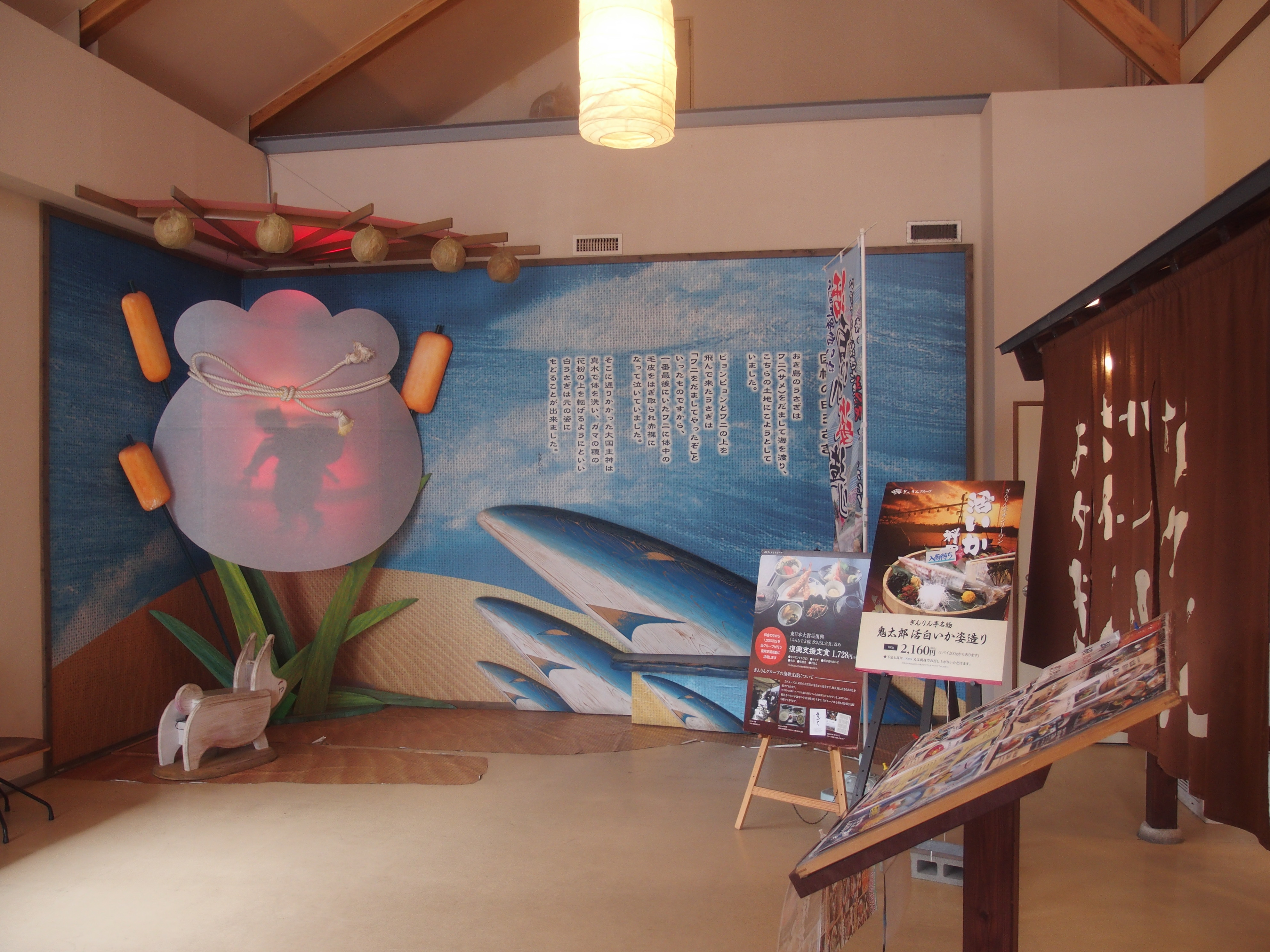 道の駅 神話の里 白うさぎ 2017/1/20(9年前) 山陰, 島根, 日記 (2017年1月8日) 今回の旅は天気が悪いので,メインは食べ歩きです. 道の駅 神話の里 白うさぎで甘海老とカンパチを食べました. 店の前です. 道の駅の駅長といううさぎ. 他にも因幡の白兎に関するものが色々あります.