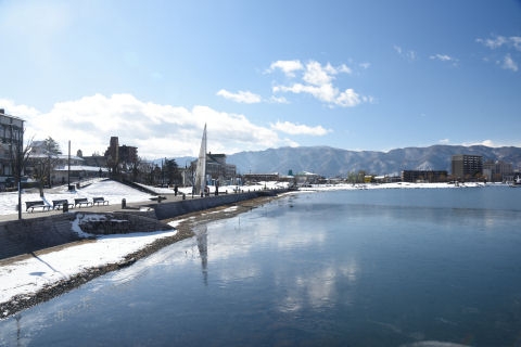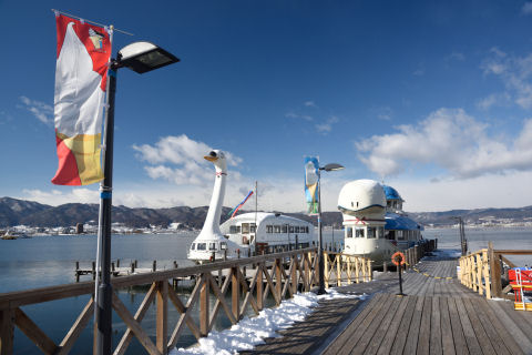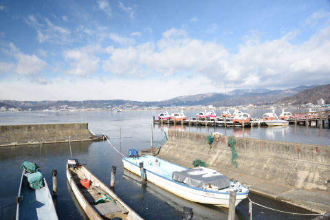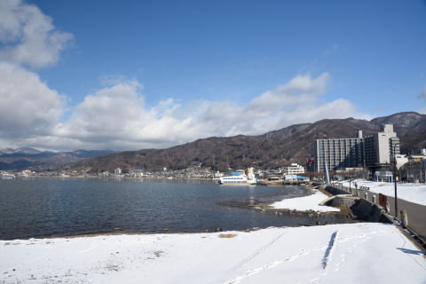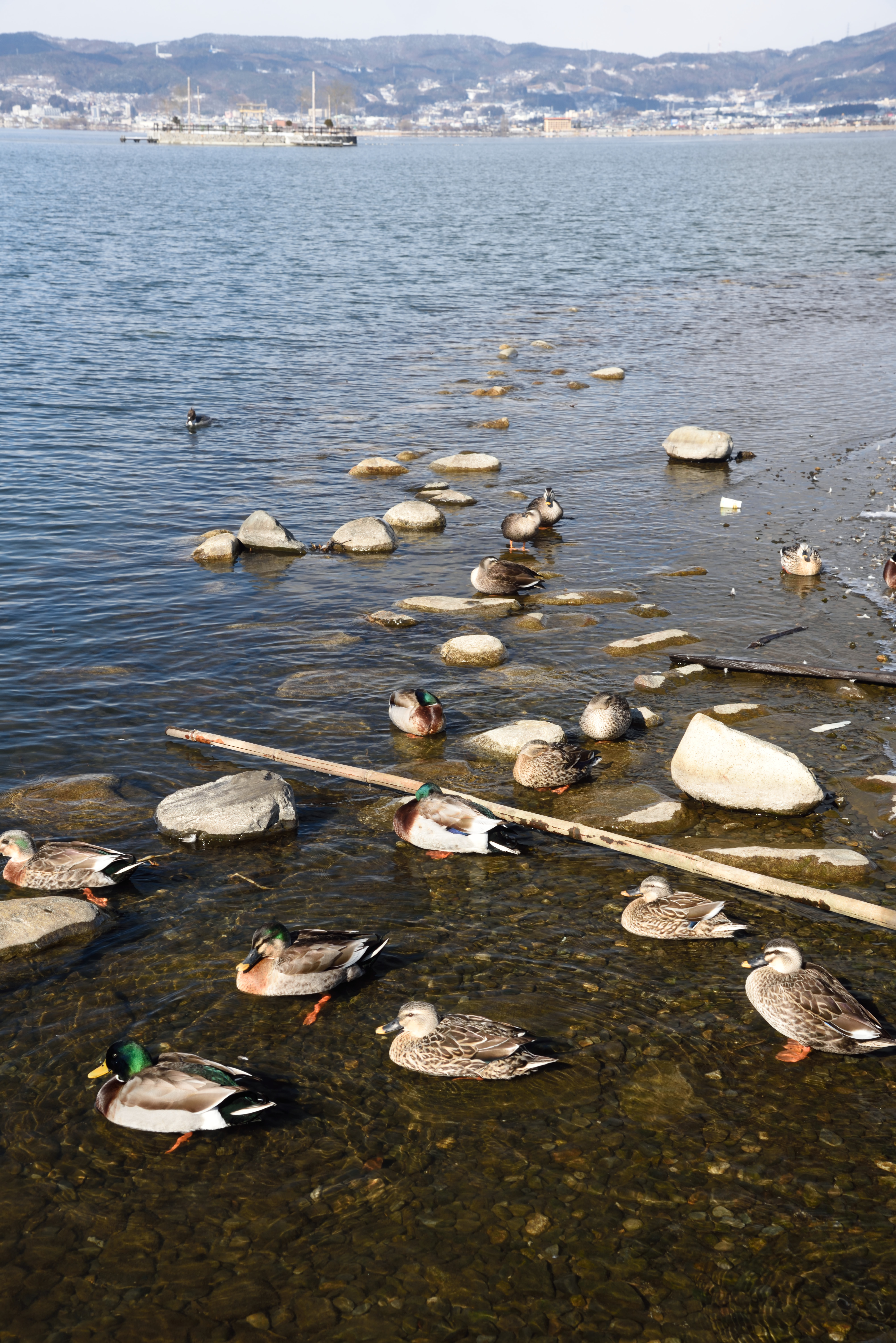 諏訪湖畔を歩く 2017/2/11(9年前) 写真, 東海 諏訪湖畔を少し歩きました. 水は少しだけ凍ってます. こんなに寒くても鴨は水面にいます. 御神渡りが見られればと思い諏訪に来ましたが,残念ながらダメでした. 今年もダメだったら4年連続になるそうです. 諏訪湖も見たので早々に帰りました.