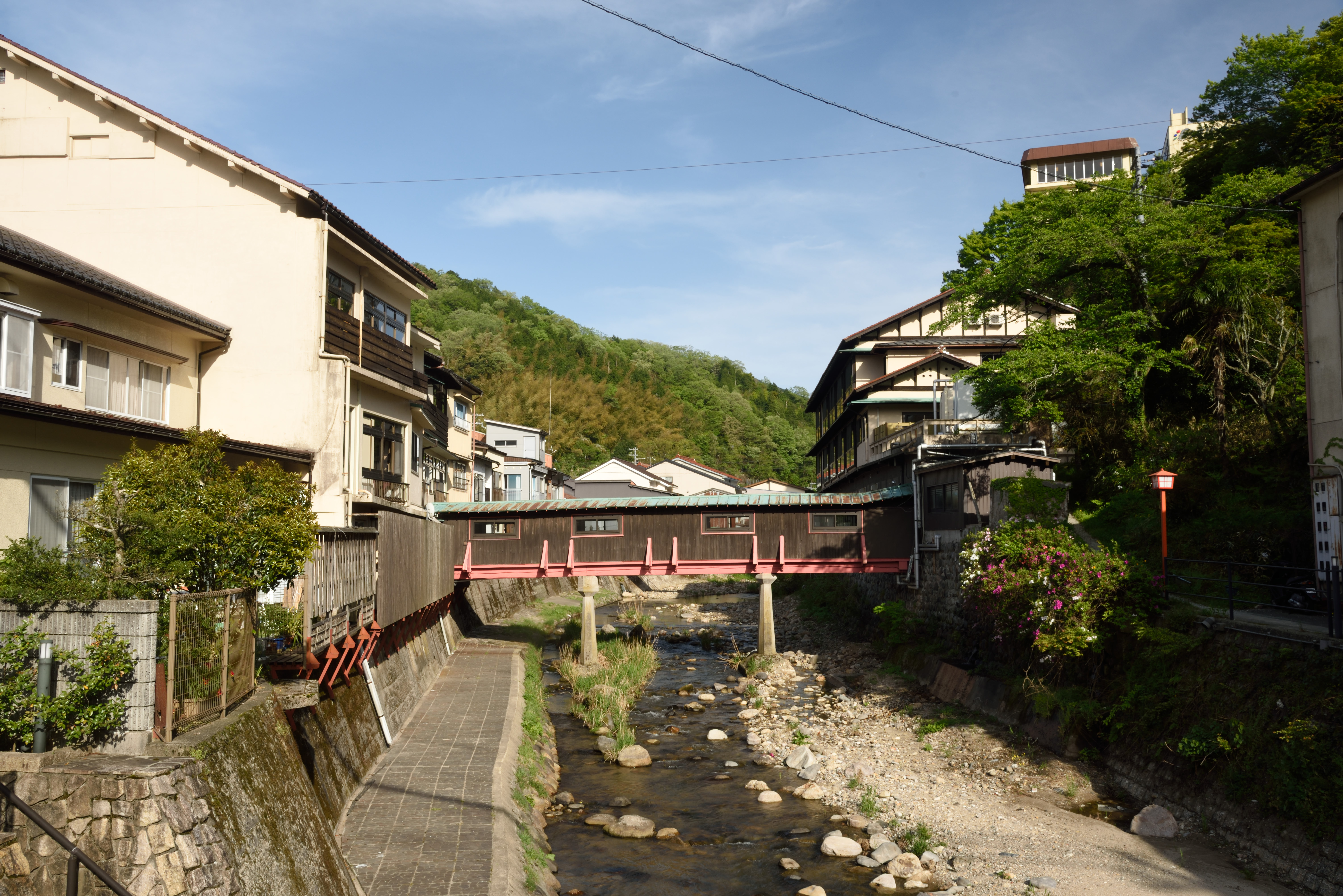 備美但の旅~湯村温泉 2017/5/17(9年前) 兵庫, 写真, 近畿 (2017年5月2日) 浜坂駅からバスに乗り,この日の宿がある湯村温泉に来ました. こちらは湯村温泉の中心の様子. 湯村温泉は98度の高温泉が毎分470リットル湧出ているそうです. 店では卵や野菜が売っていて,そのお湯に付けて食べられるようになっていました. 湯村温泉は848年に慈覚大師によって発見されたと伝えられています NHKテレビドラマ「夢千代日記」の舞台として有名だそうです. どこかの旅館の渡り廊下.老舗温泉という感じがします.