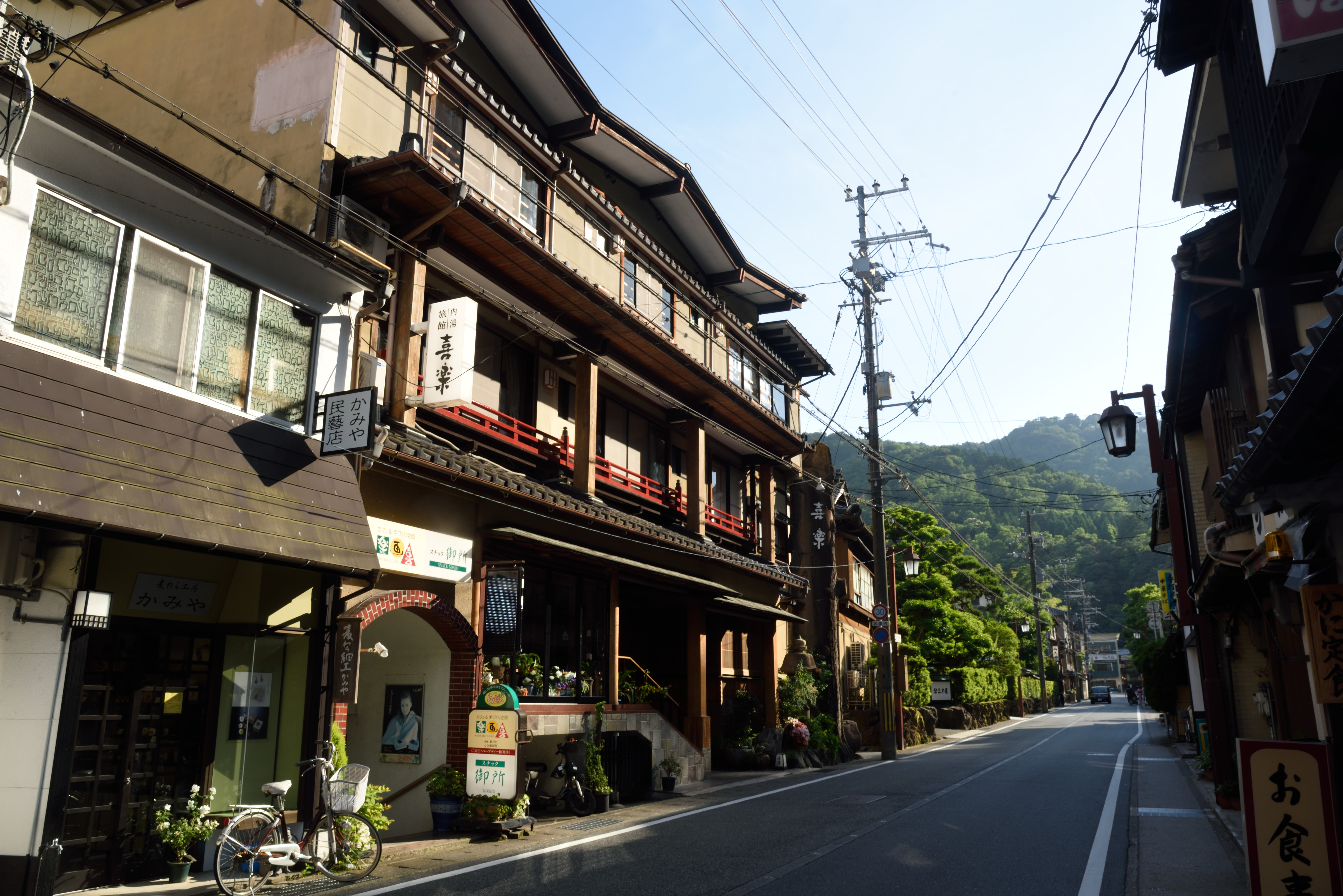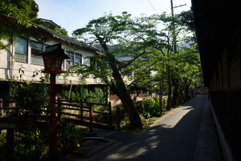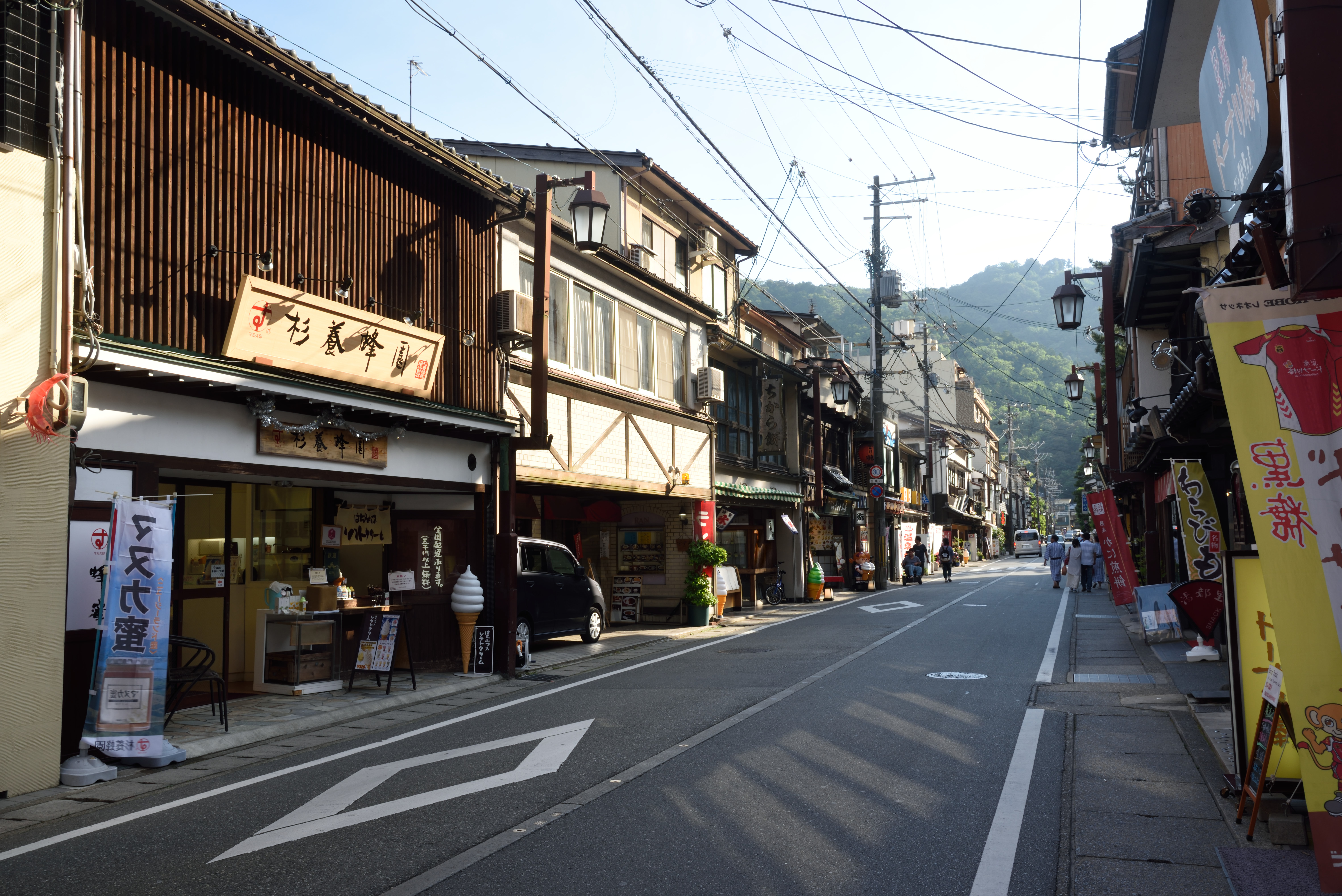 木屋町小路の1本隣にある,湯の里通り.奥の方には老舗旅館,街の中心の方は観光客向けの店が立ち並びます.