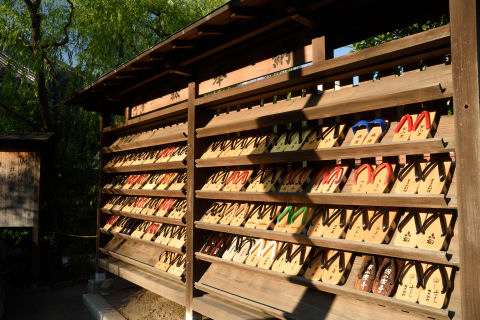 駅前にある,下駄奉納.城崎温泉は浴衣で歩くことを推奨しています.