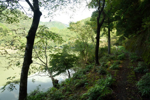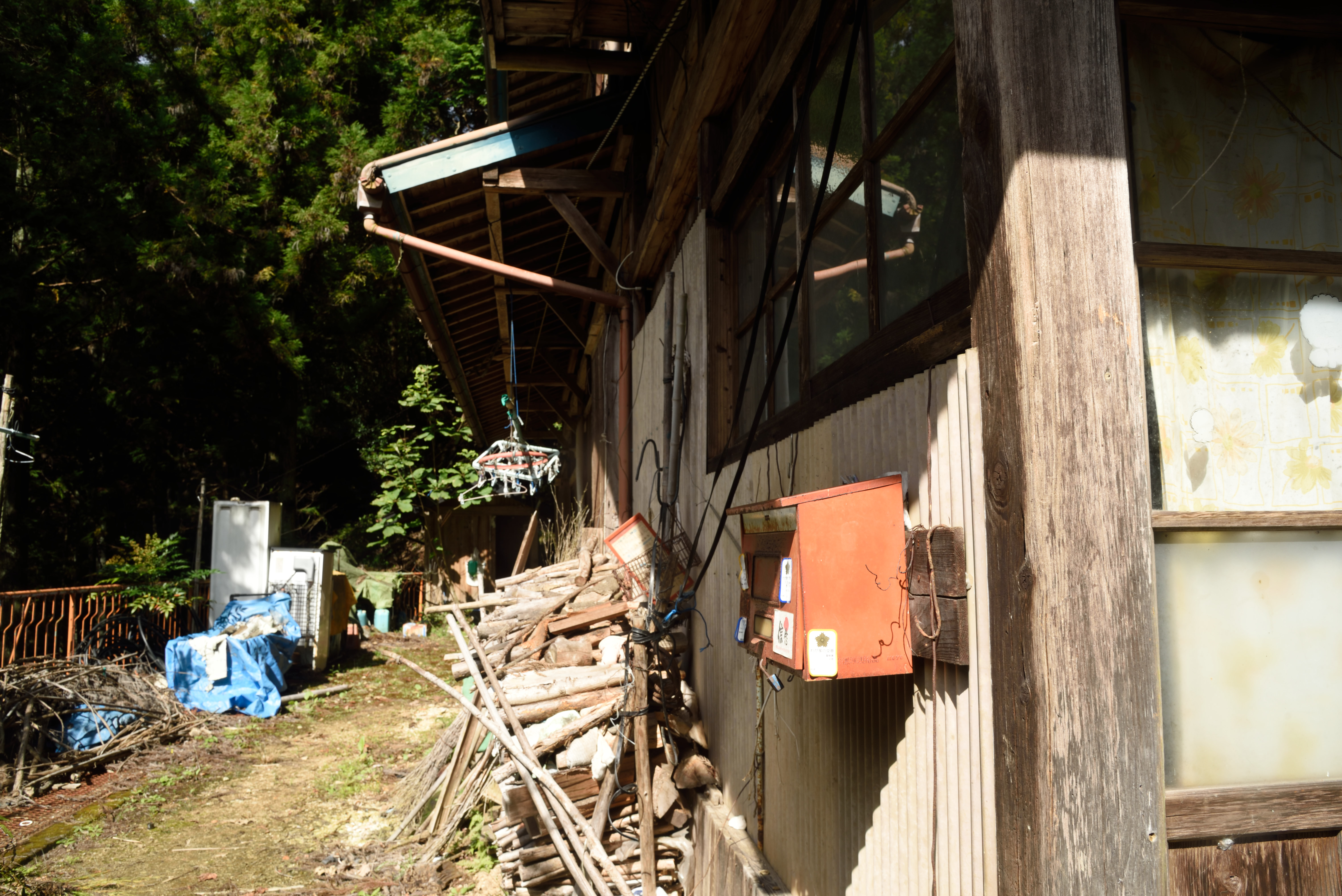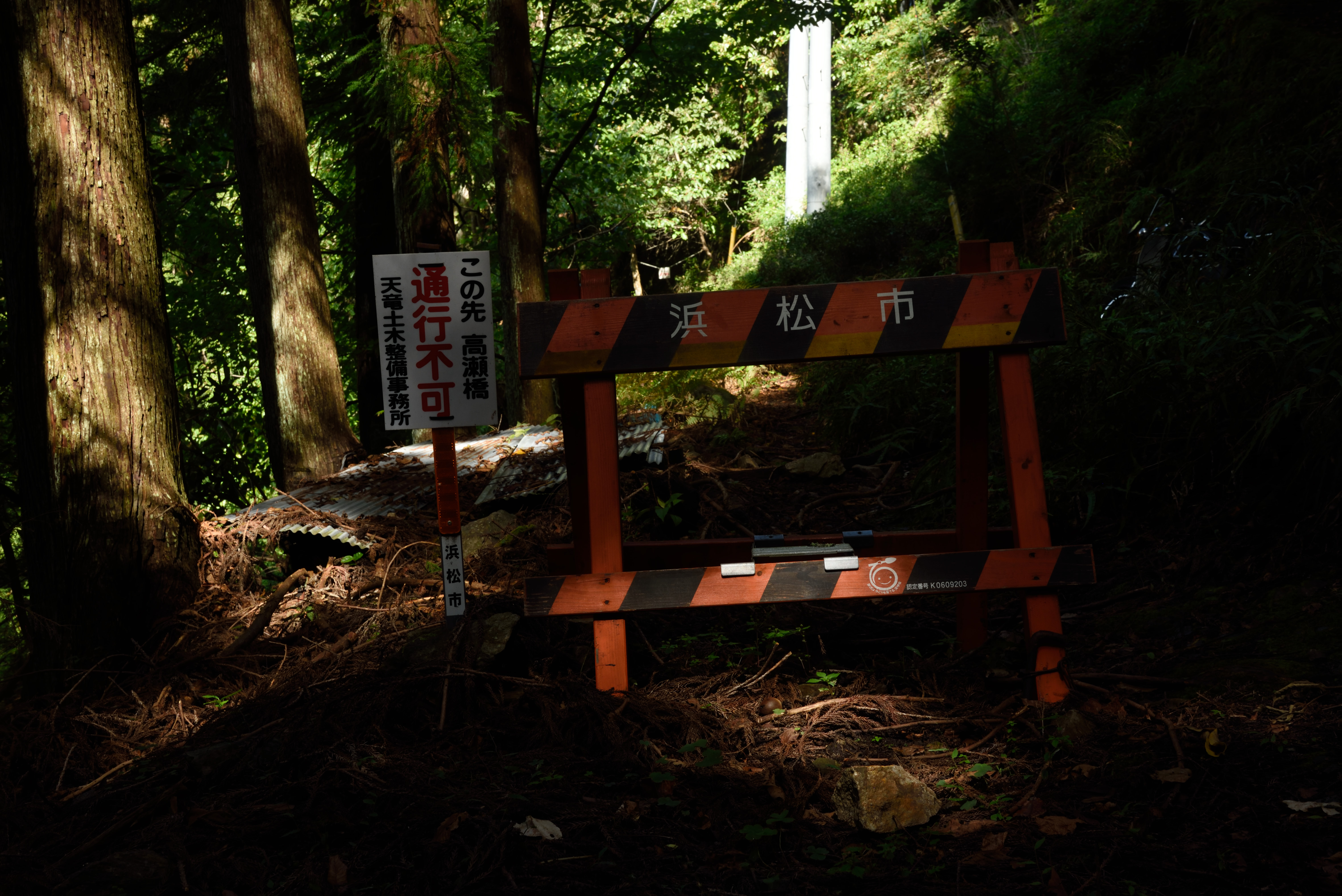 小和田駅周辺 2017/10/24(8年前) 写真, 東海 (2017年10月8日) 分離可能な愛のベンチの下には廃屋が2軒.製茶工場だったそうです. 25分ほど歩くと高瀬橋(崩落中)があるそうなので,そこまで歩いてみることにしました. 道はけもの道ではなく舗装されていました. 「この先 高瀬橋 通行不可」の標識が. 道も荒れていたので,これ以上進むのは断念しました. 近くに1軒だけ民家がありました. このとき人はいないようでしたが,他の日にいるのかはわかりません.