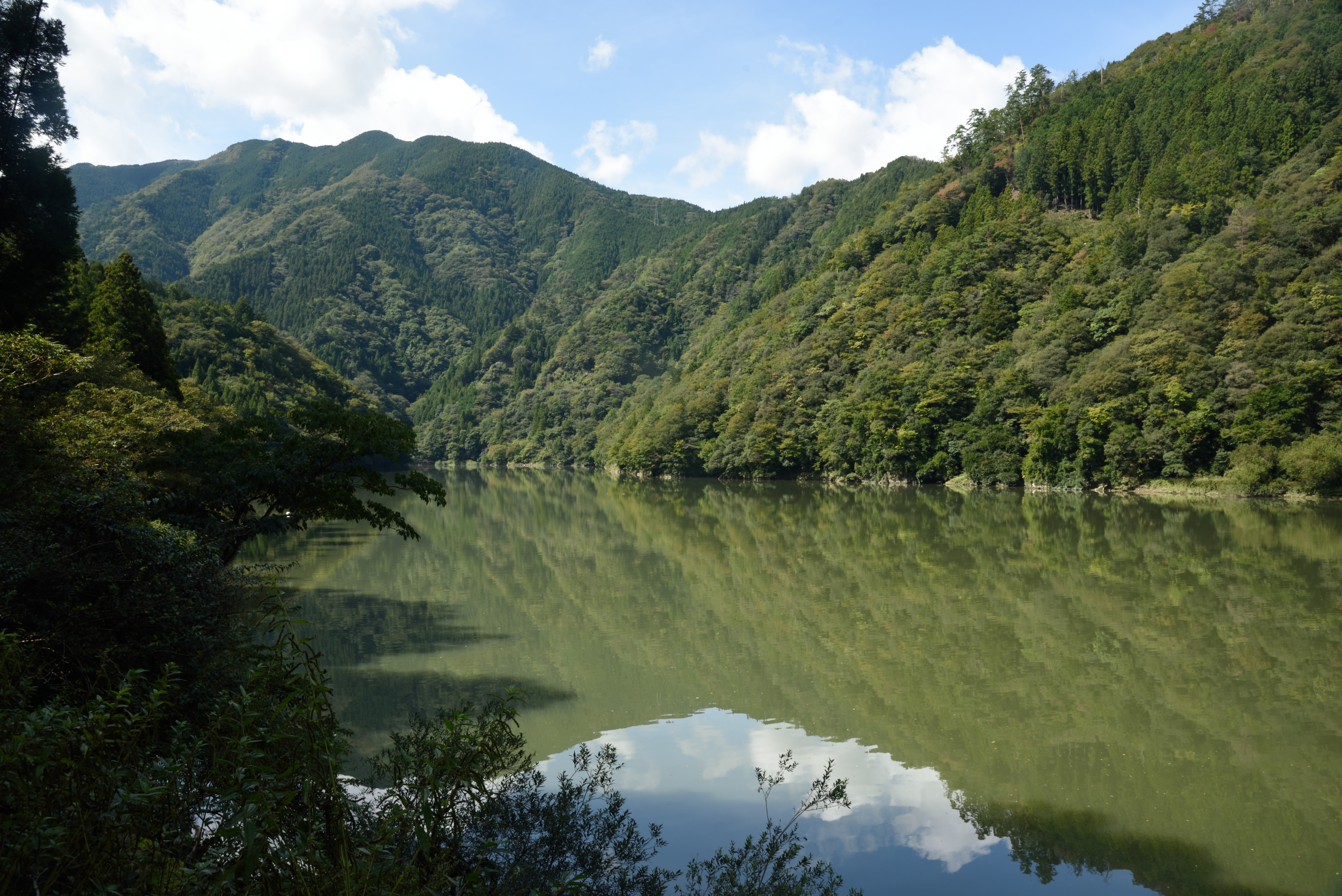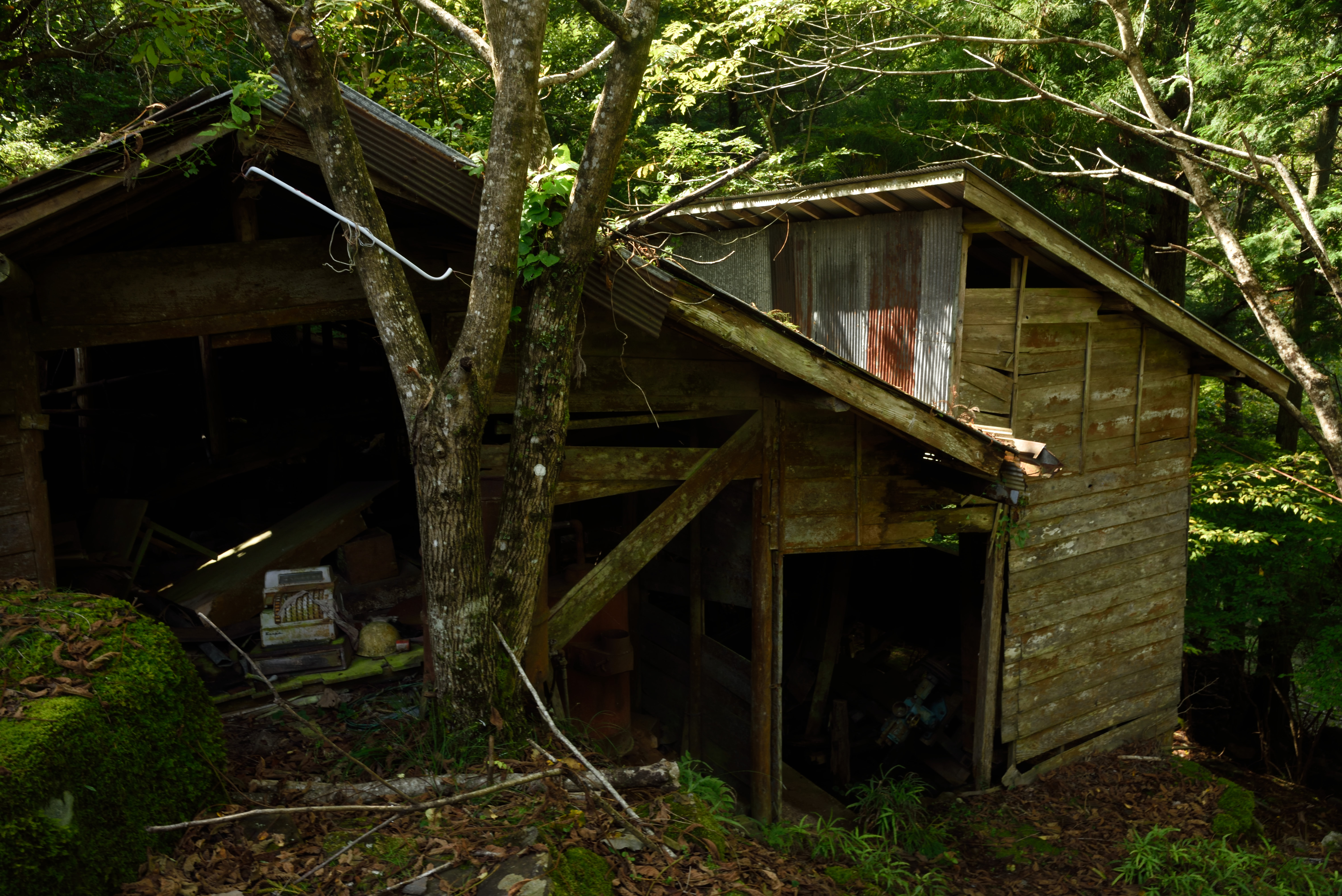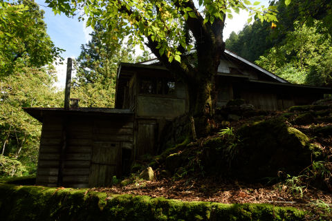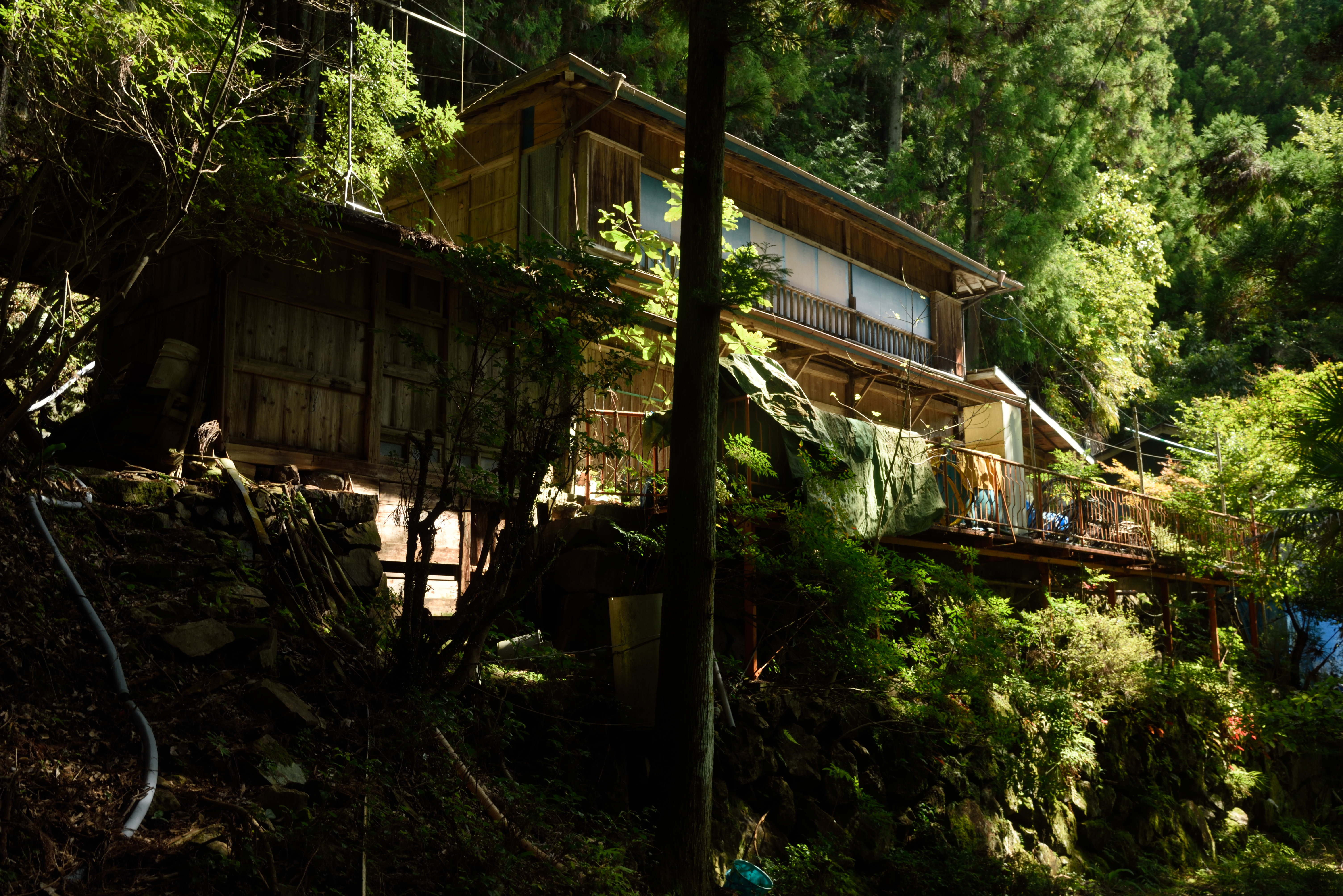 小和田駅周辺 2017/10/24(8年前) 写真, 東海 (2017年10月8日) 分離可能な愛のベンチの下には廃屋が2軒.製茶工場だったそうです. 25分ほど歩くと高瀬橋(崩落中)があるそうなので,そこまで歩いてみることにしました. 道はけもの道ではなく舗装されていました. 「この先 高瀬橋 通行不可」の標識が. 道も荒れていたので,これ以上進むのは断念しました. 近くに1軒だけ民家がありました. このとき人はいないようでしたが,他の日にいるのかはわかりません.