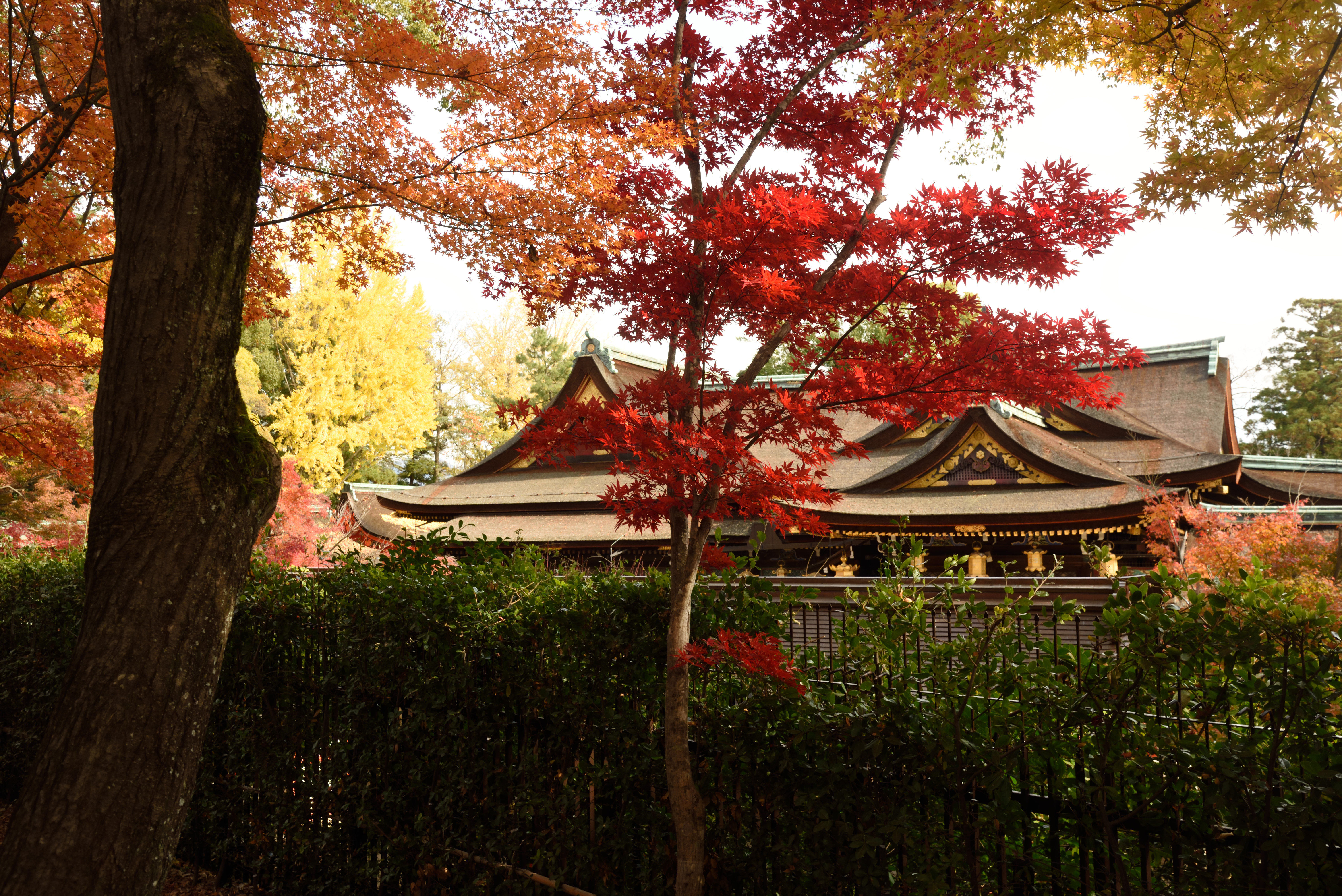 もみじ苑から紅葉・黄葉を入れつつ本殿を.