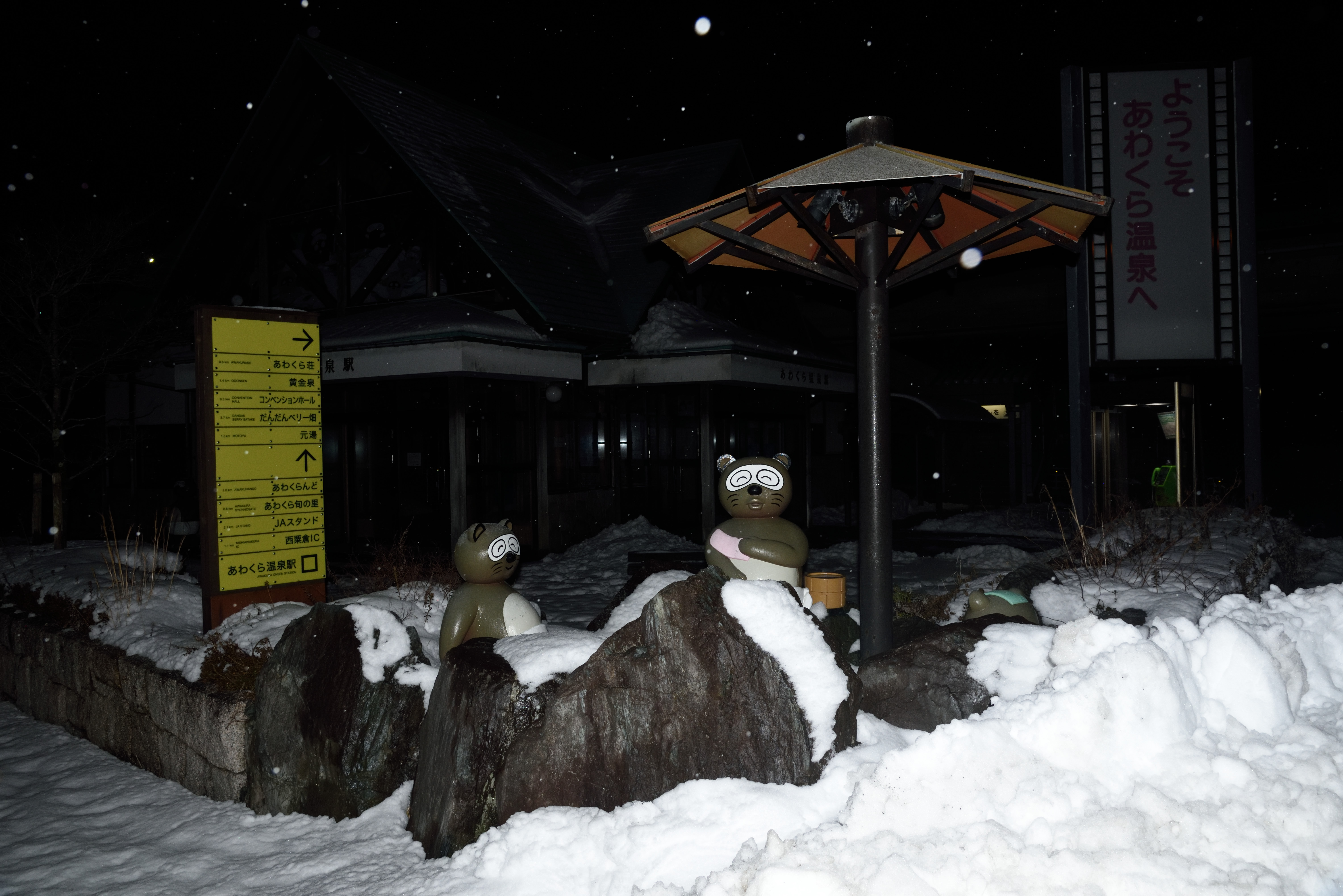 こちらは駅舎の前のたぬきの像.後ろに駅舎がありますが,フラッシュの光がほとんど届いていません.
