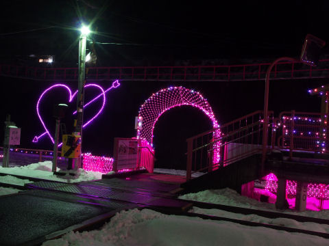 このとき電車に乗っていたのが3人,降りたのは自分だけ,待合室もない無人駅という超過疎駅で,このピンクさはとても異様です.