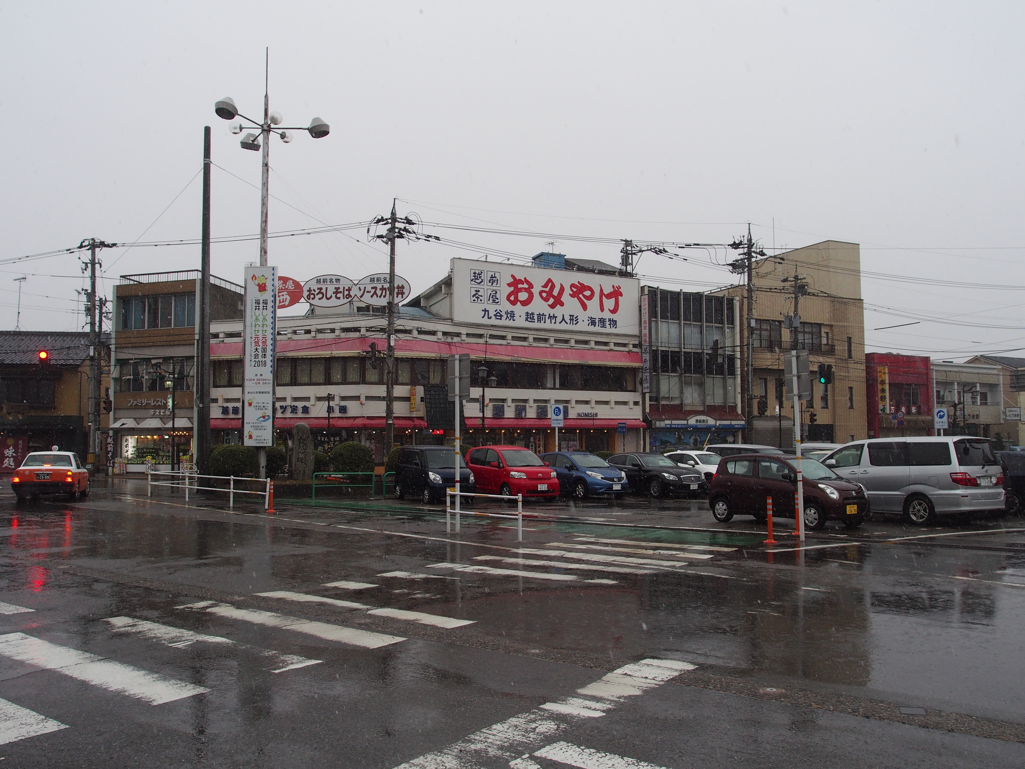 駅前の写真です.おろしそば・ソースかつ丼という福井らしい看板が見られます.