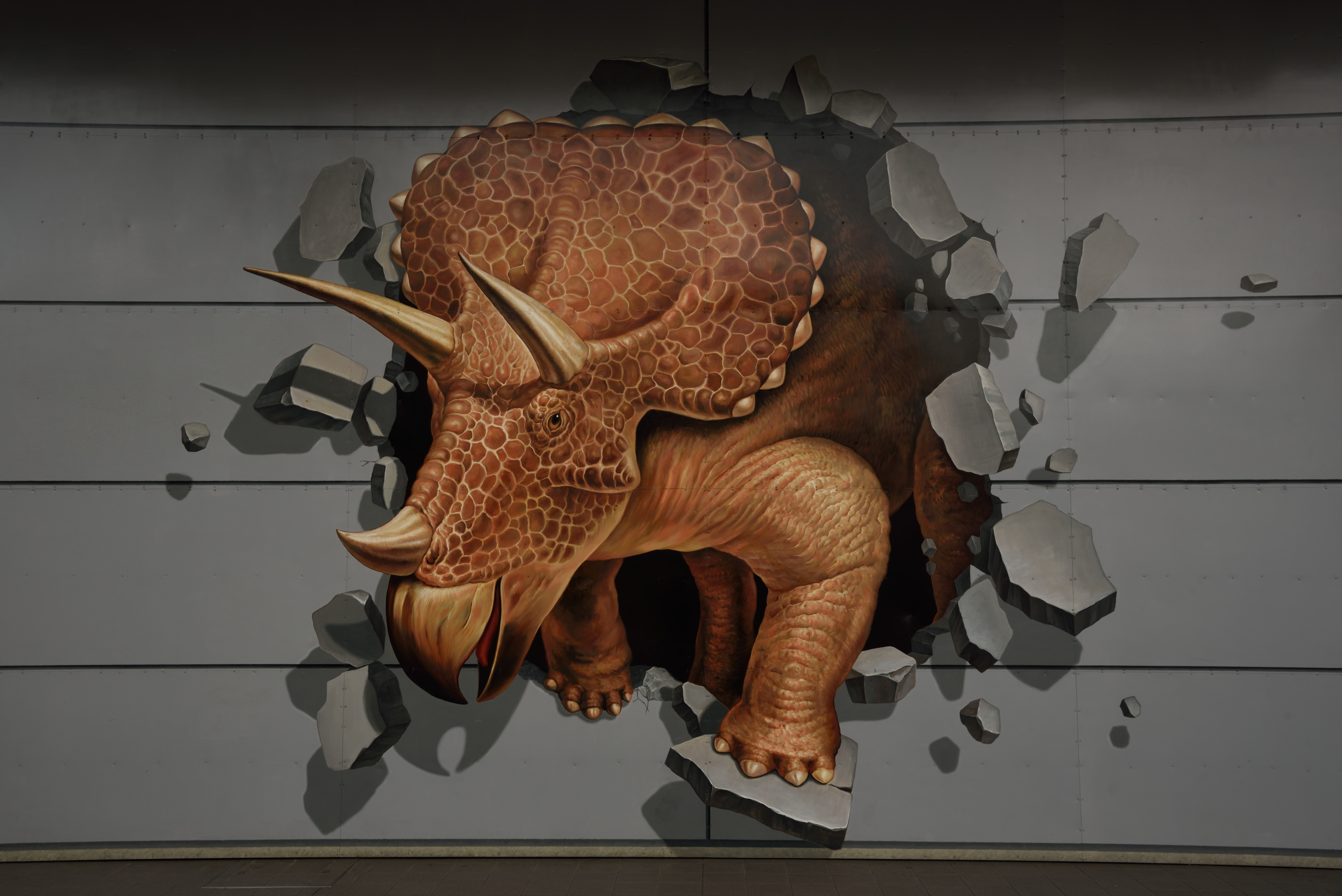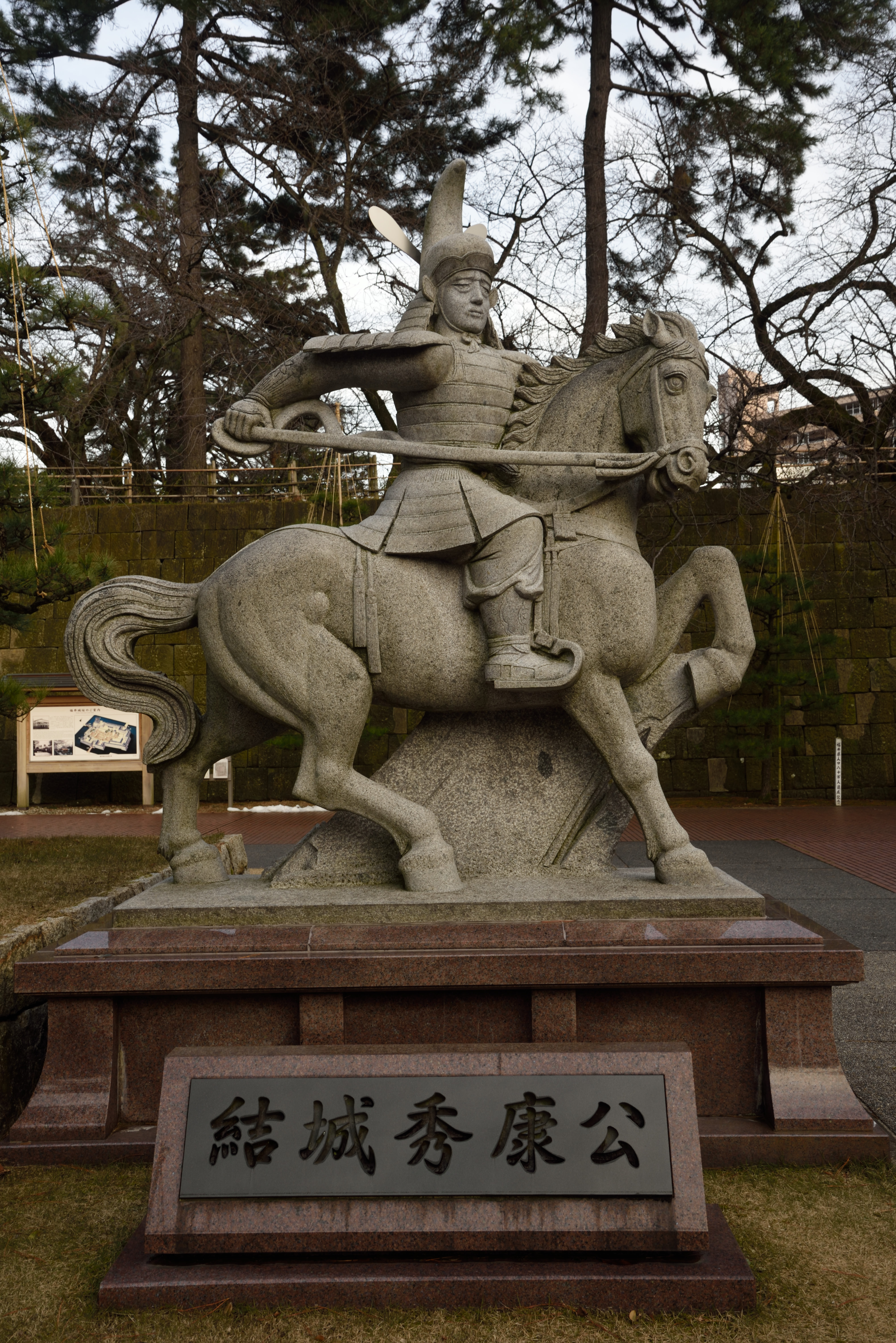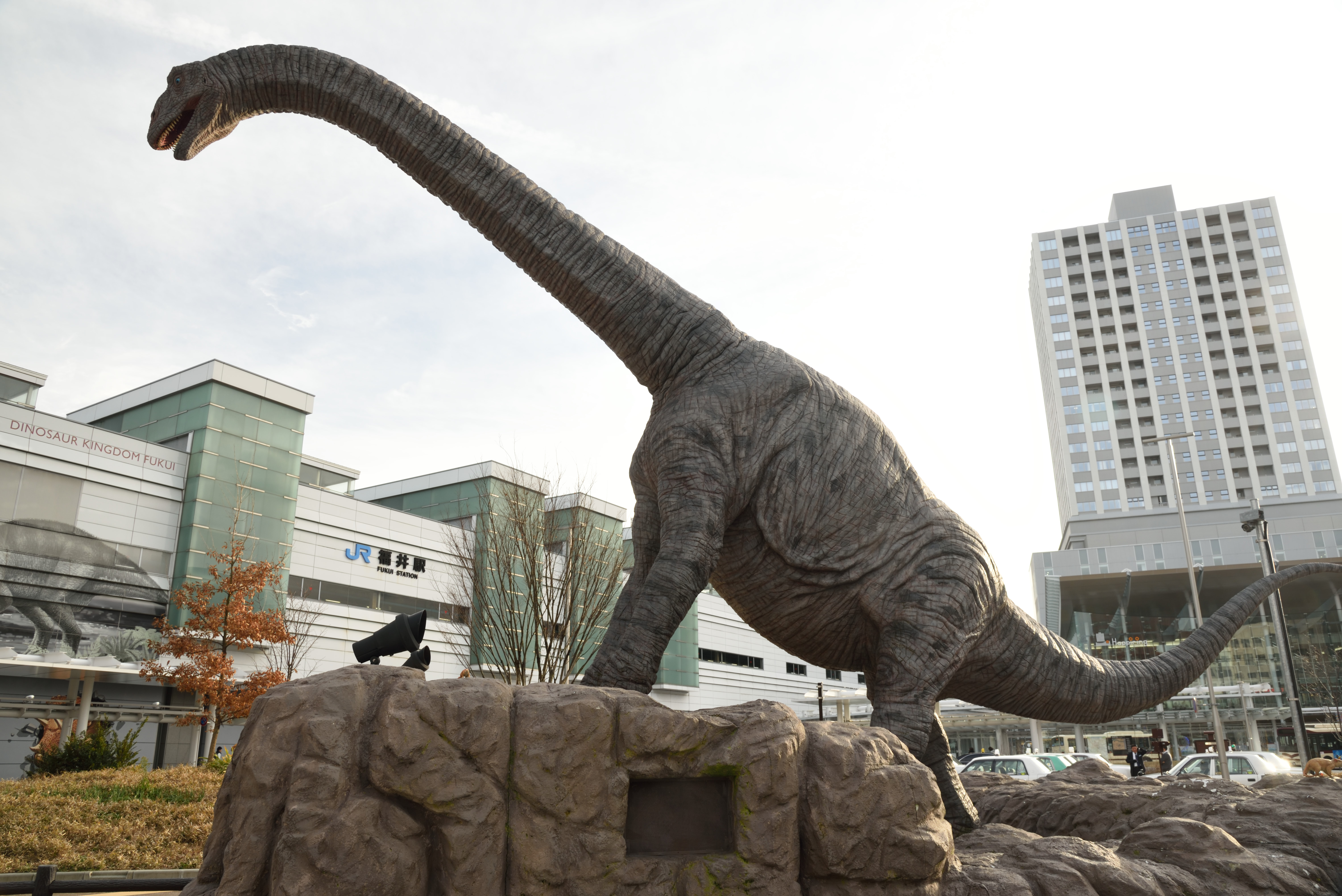 福井駅周辺 2018/1/24(8年前) 写真, 北陸, 福井 (2018年1月7日) 服役に戻って来ました.帰りの特急まであと1時間ほどあるので,周辺を散策しました. 福井駅は恐竜の絵が描かれ,駅前には動く恐竜の像があります. 駅の壁に描かれた,飛び出しているように見える絵です. 続いて今は県庁が建てられている福井城址へ行きました. 後に福井城と改名される北ノ庄城を築いた徳川家康の次男,結城秀康の像. 福井という名の由来となった福の井という井戸です. 駅構内のスーパーに「ようやく入荷しました!」という札とともに売っていた今庄つるし柿. 囲炉裏で燻製しているという珍しい干し柿だったので,土産に買いました.