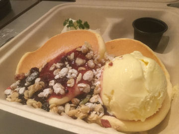 フードコートになっていて様々なものがありますが,今回はぎょうざ処 亮昌の九条ねぎ餃子,今日の焼肉処 弘の焼肉串,PANCAKE ROOMのパンケーキを食べました.