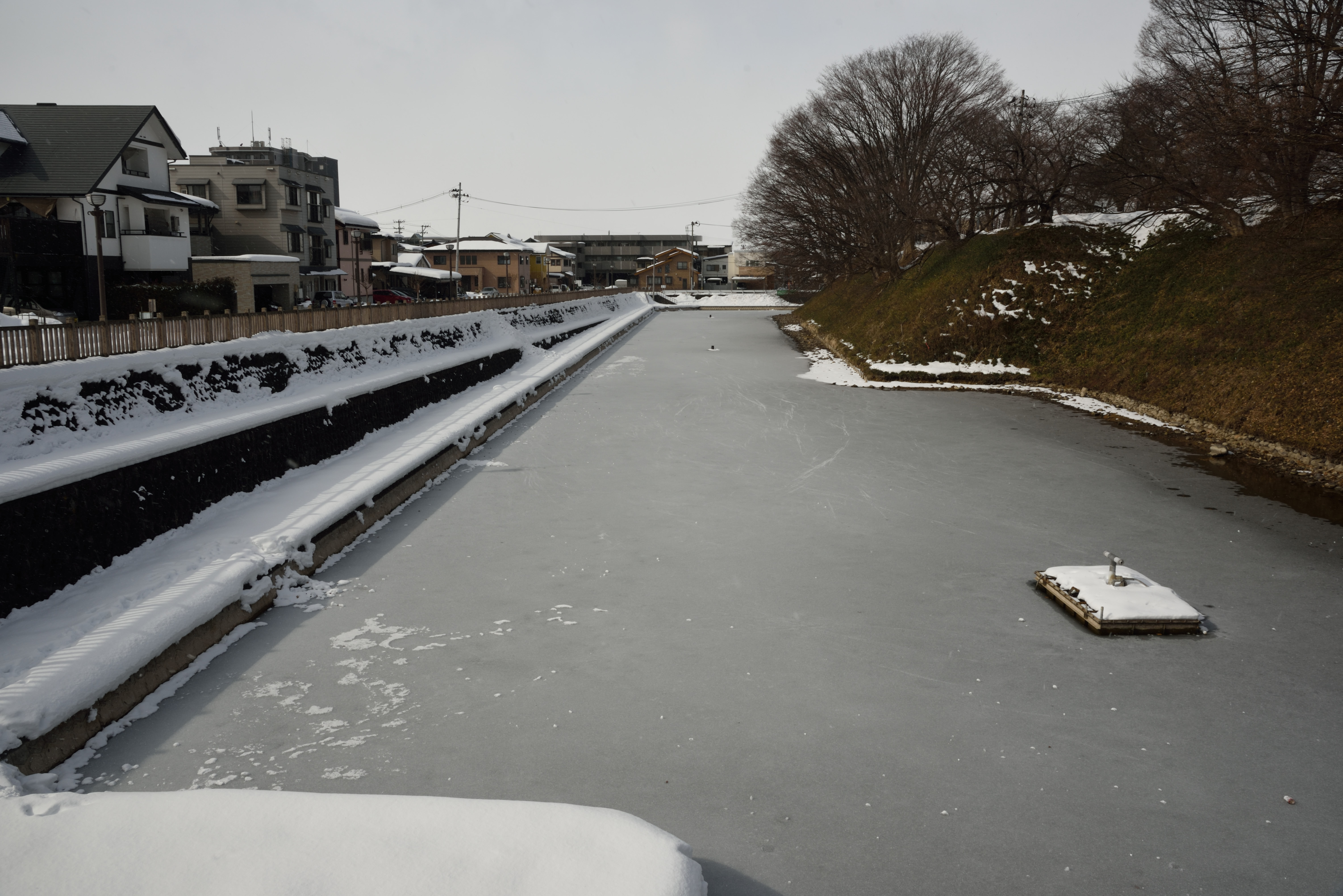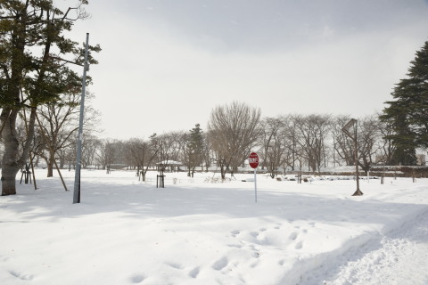 行ってみると堀は凍り,公園のほとんどが雪に覆われ,本丸は冬季は封鎖されていました.さすが雪国です.