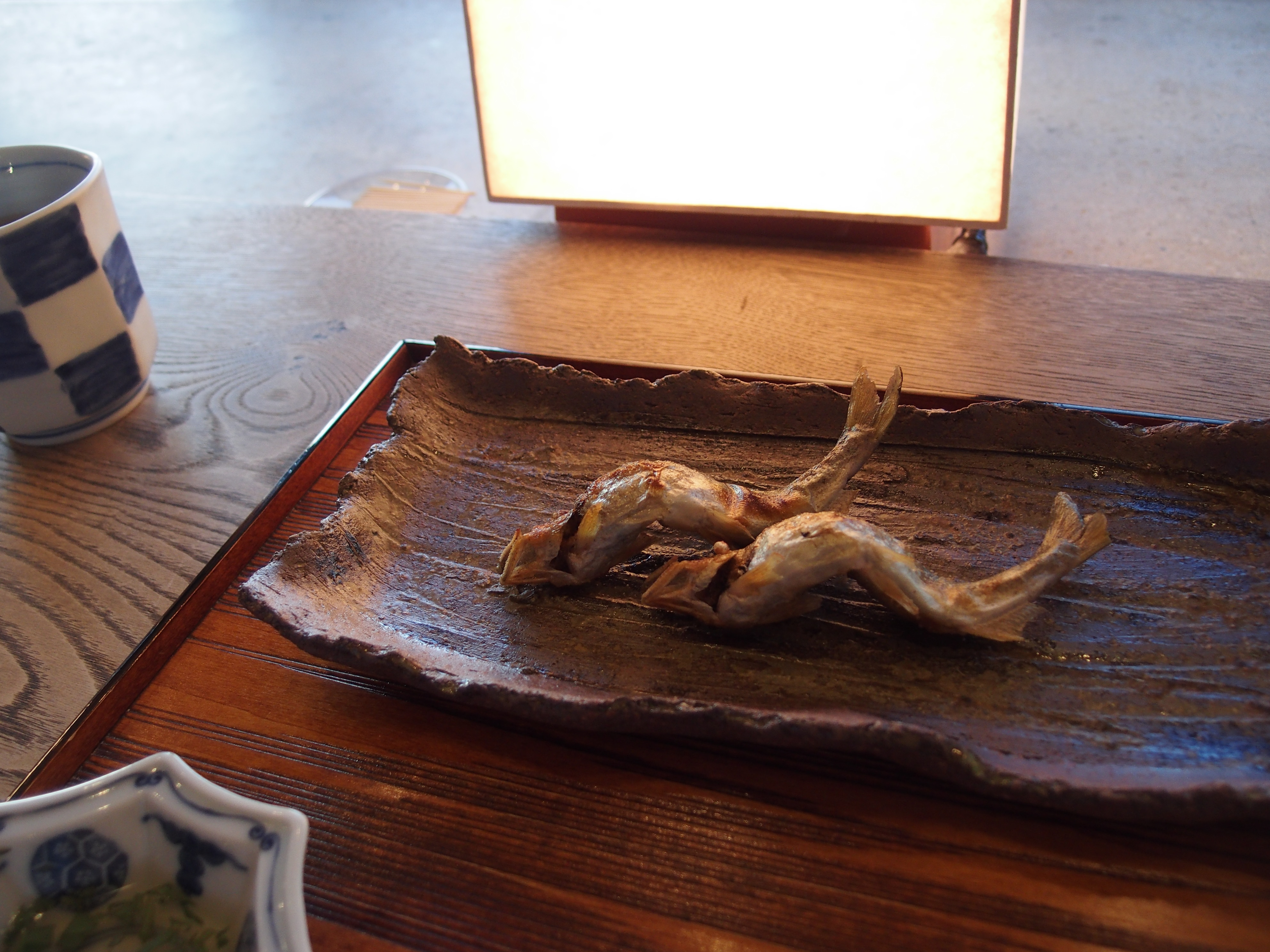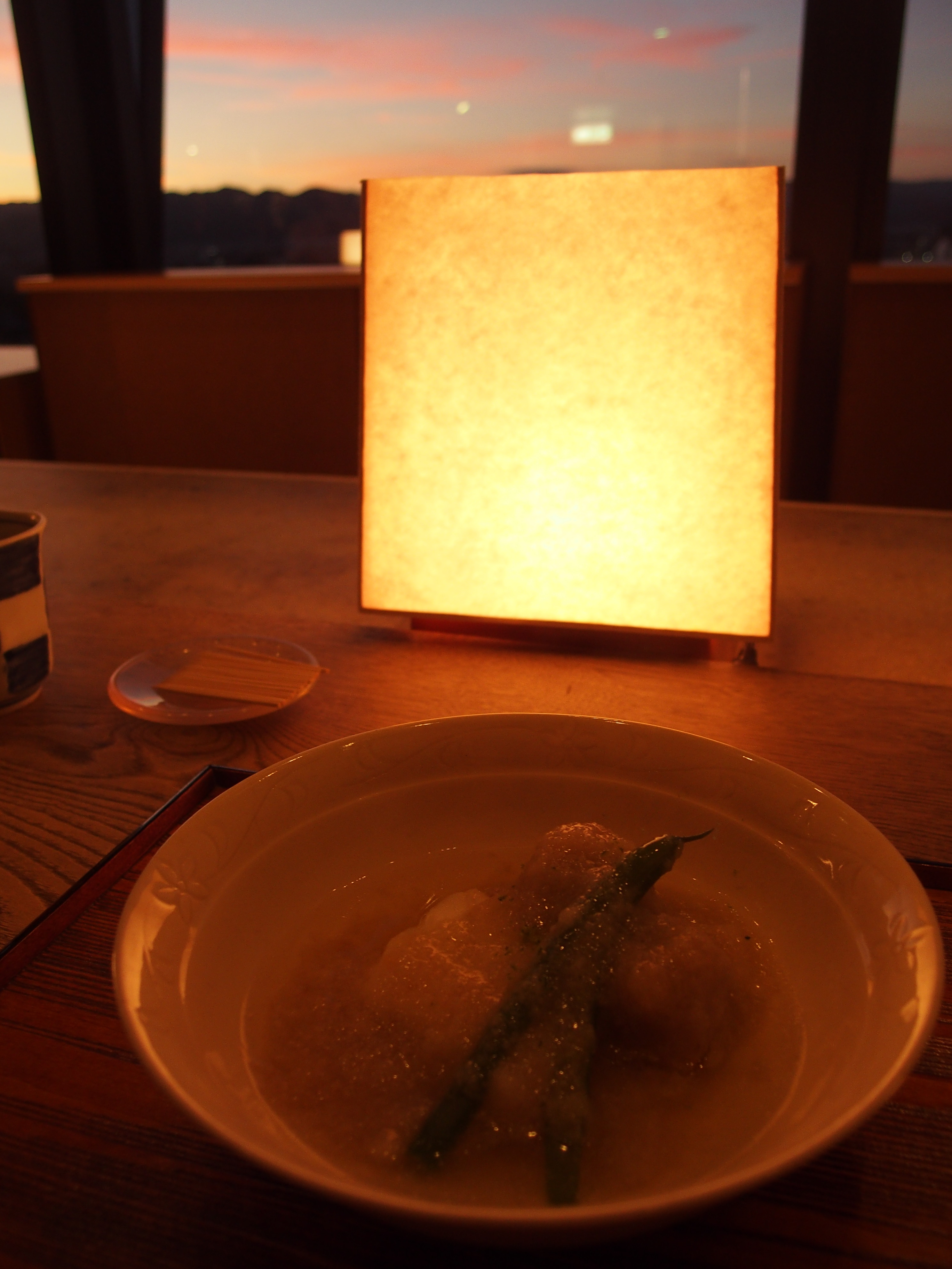 紅花コース@京都和久傳 2018/7/22(8年前) 京都, 日記, 近畿, 食べ物 (2018年7月21日) 親が京都に来ているので,先月の地震の話などもありそれに合わせて自分も行きました. 夕食は,いつも行く京料理屋といえばぎおん楽楽ですが,そこ以外行ったことがないので今回はJR京都伊勢丹にある京都和久傳に行きました. 予約で6時半頃に入店.運よく眺めの良い席でした. 最初の料理は京都らしく鱧. 若鮎. 食事が進むにつれて日が暮れて行きました. ちなみにこちらは(確か)はたと蓮根の煮物.