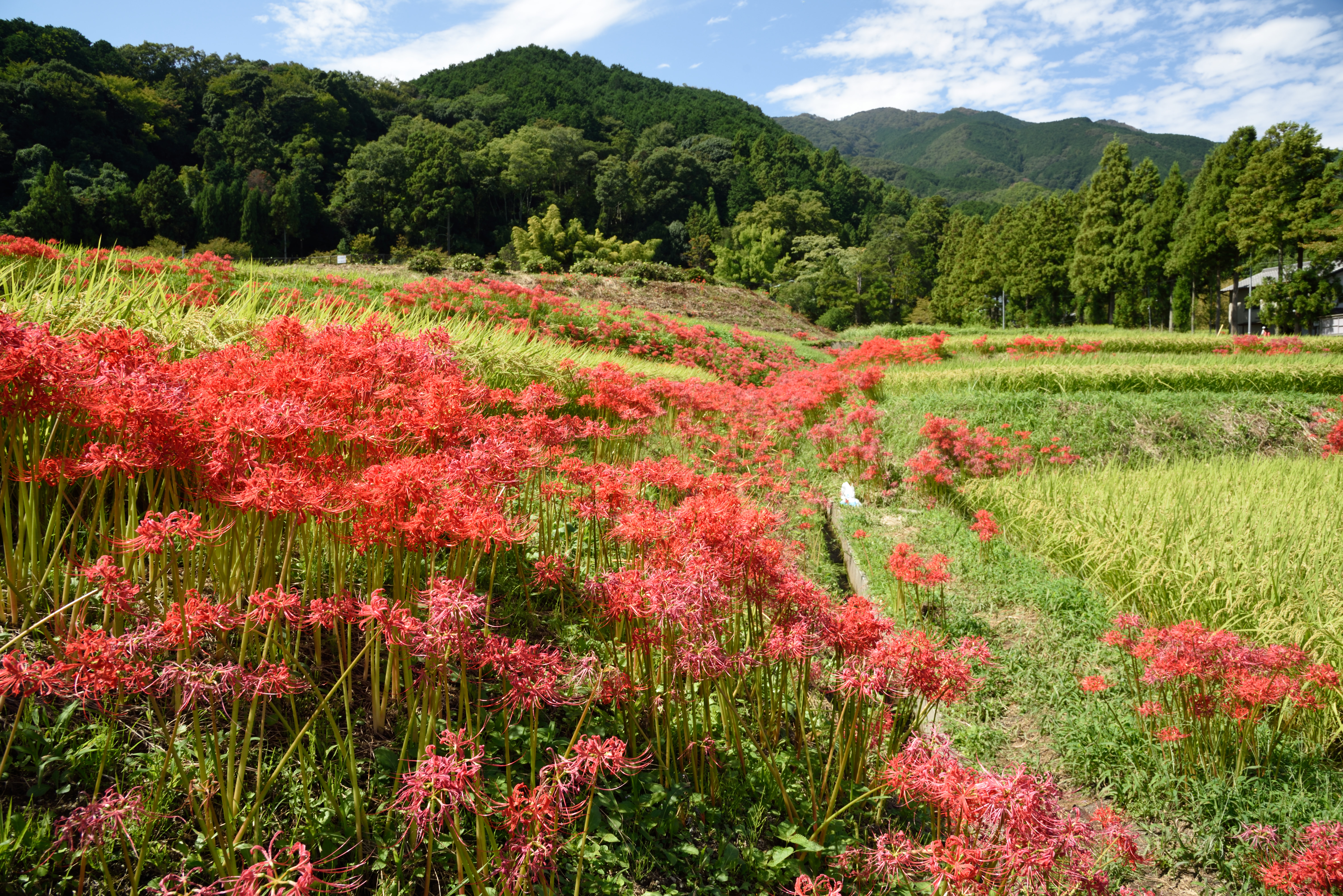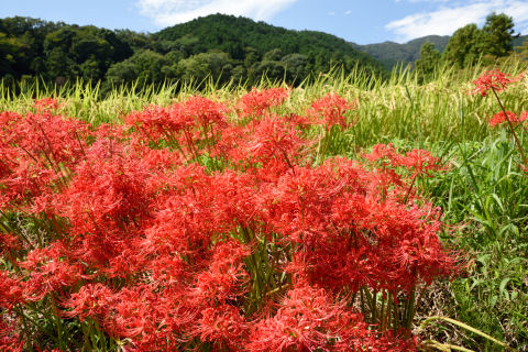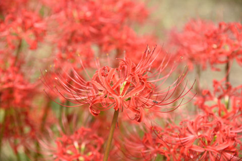 葛城の彼岸花 2018/9/23(8年前) 写真, 奈良 彼岸花の季節なので彼岸花の名所に行きました. まず行ったのは奈良の葛城と呼ばれた辺り.彼岸花の名所です. 過去にも行っていますが,今回は親の案内でもあります. まずは九品寺. 御所市が見渡せる場所に彼岸花が群生しています. 彼岸花のズーム. 続いて葛城一言神社. 多少の高低がある田んぼに彼岸花が多くの彼岸花が咲いていました.