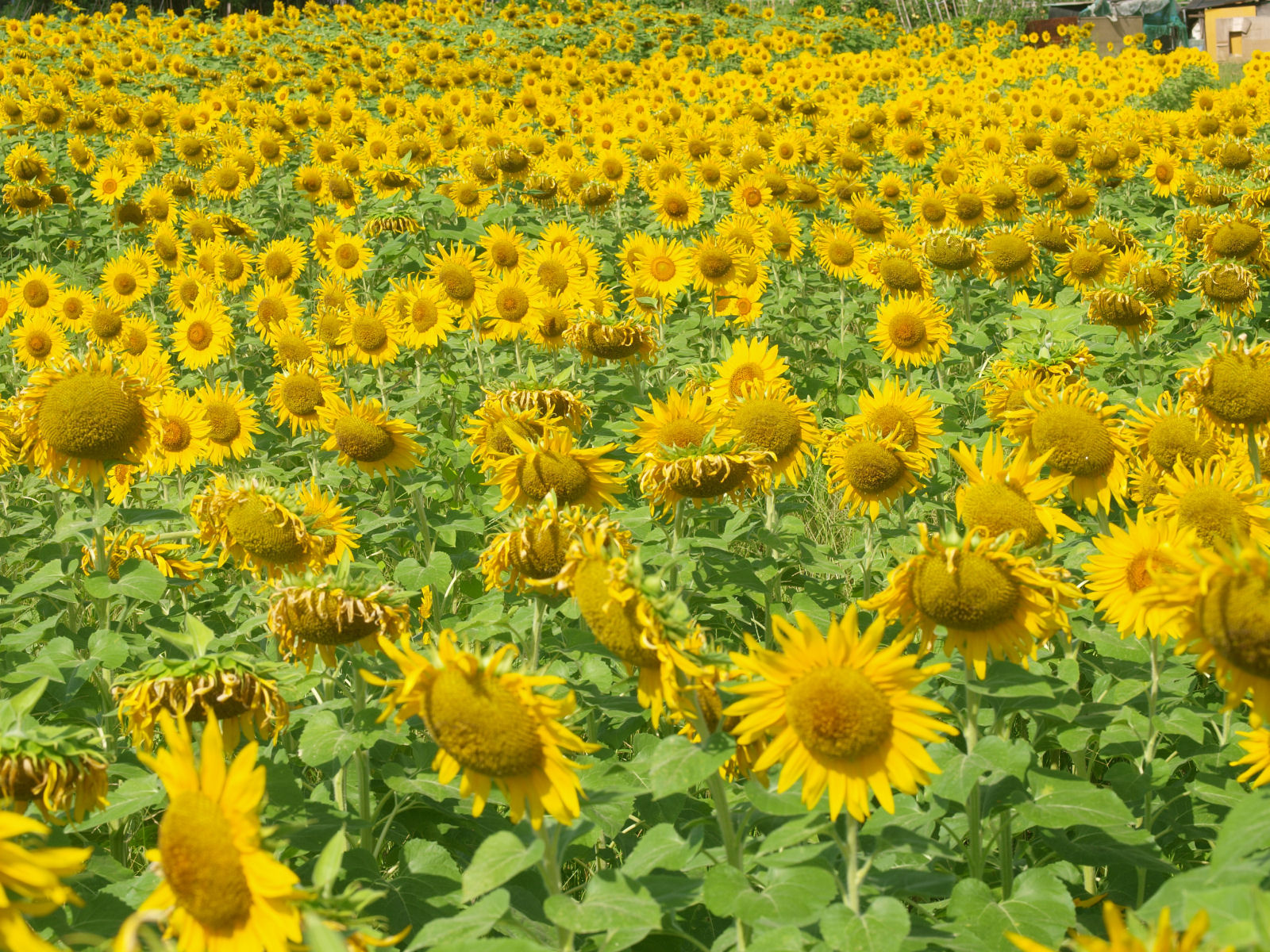 向日市のひまわり畑 2009/8/8(17年前) 写真 長岡京市の隣にある向日市では,市の花がひまわりということもあり,毎年どこかの休閑地をひまわり畑としています. 去年も一昨年も気がつけばひまわりの時期を逃していましたが,今年はたまたま通った道がひまわり畑となっていたので,気づくことができました. ということで,ひまわり畑です.けっこう広かったです. ただ今年もちょっと見頃を過ぎてしまったようで,近くの畑にいた人によると,「2日前がちょうど見頃で,今はそれより花が下を向いてきている」とのことでした.なんてこったい. アップ. ちょっと離れて. たくさんの花が入るように これら3枚は換算100mm単焦点レンズにて撮影(最初のは換算22mm広角).