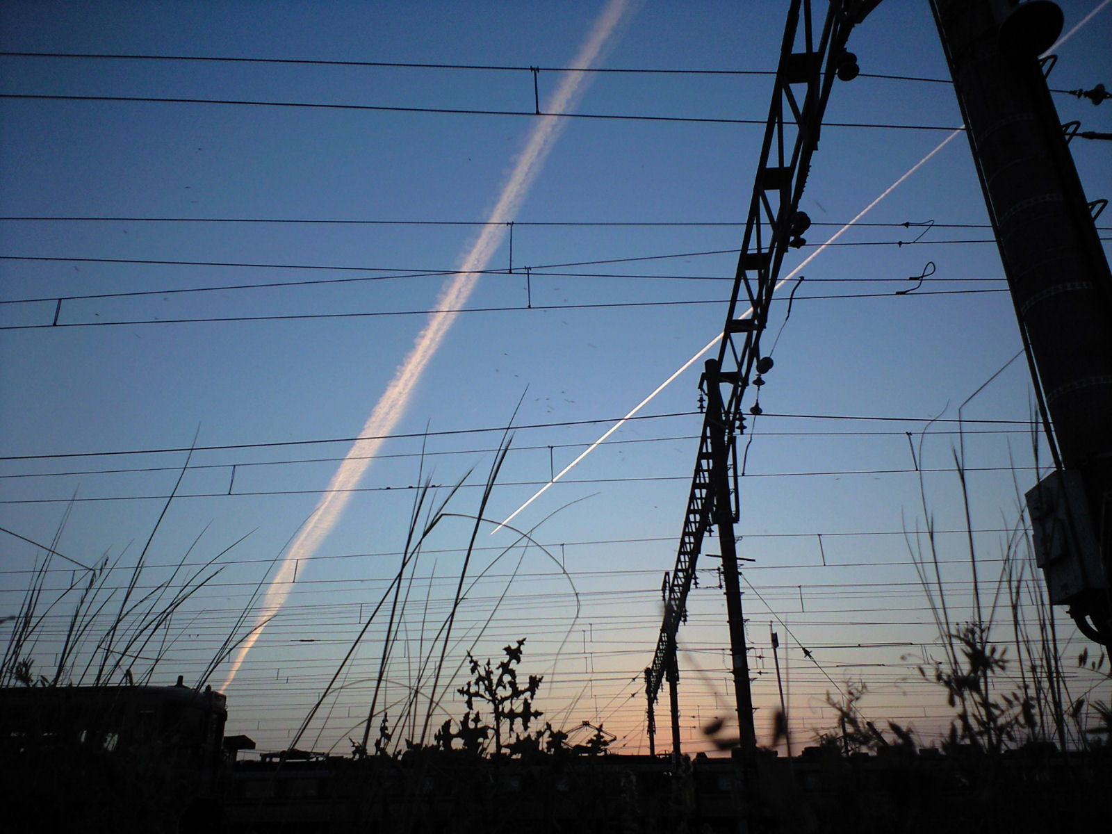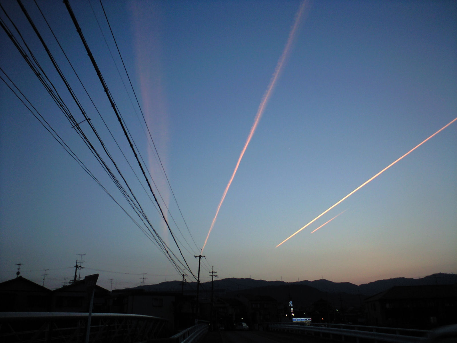 飛行機雲 2010/5/16(16年前) 日記 夕方の帰り道,空には一条の光が. 夕日を受けて輝く飛行機雲でした. 天気,飛行機,外出タイミングが合わないと見られない光景.ラッキーでした. しばらくした後,飛行機雲が2つに.さらにめずらしい. 4つ・・・だと・・・?