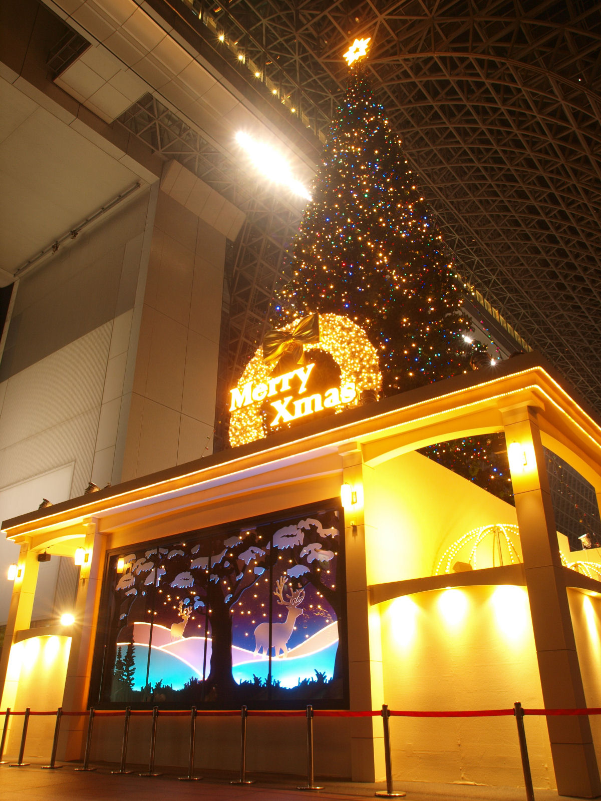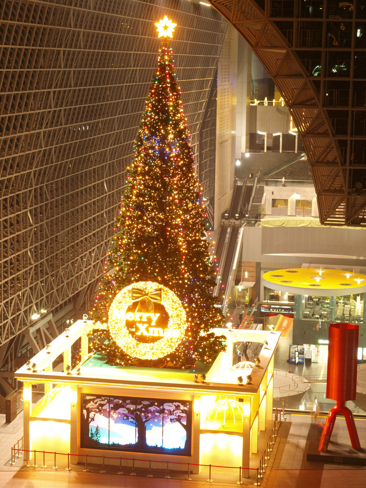 メリクリ from 京都駅 2010/12/25(15年前) 京都, 写真 明けましてメリクリ! きよしこの夜・・・きよしこって誰? ということで京都駅のクリスマスツリーの写真です. なお撮影は数日前です. 階段の上の方から. 左側はガラスに映った像です. 階段に腰掛けてゆったりと眺めている人がけっこういます. もうちょっと階段を下りたところ. 奥のエスカレーターが急勾配に見える・・・? さらに階段を下りたところ. 奥の方のイルミネーションや,駅の屋根が見えるようになりました. さらに近づく・・・・近すぎたか.