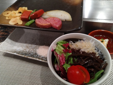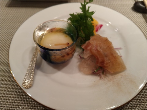 最初は前菜で温卵と鯛の昆布締め,あとスープが出てきました.