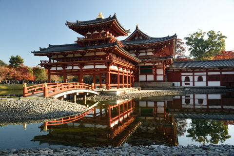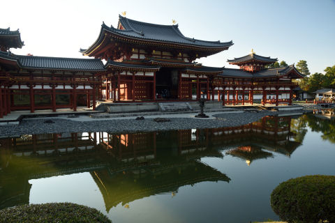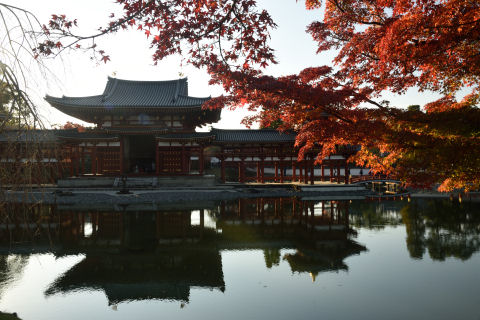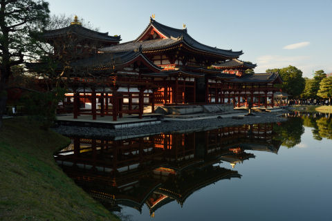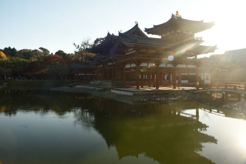 平等院鳳凰堂 2019/12/1(6年前) 京都, 写真, 近畿 将軍塚を出る頃には曇ってきたのでこの日の観光はおしまいのつもりでしたが,買い物をしていたら再び晴れてきたので,平等院に行ってみました. 駐車場に近い入口から入ると鳳凰堂の裏から見ることになるのですが,きれいに日が当たり,水面に映っていました. 一方,正面に回ると強い逆光. ここには午前に来るべきと思いました. 正面でも左側だとまだましになりました. 無風で水面が鏡のように鳳凰堂を映していました.