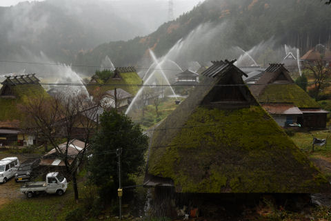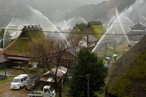 かやぶきの里 一斉放水