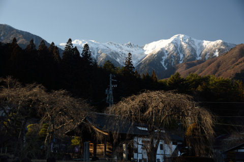 こちらは開基860年の名刹,宝積山 光前寺の山門から見える駒ヶ岳.