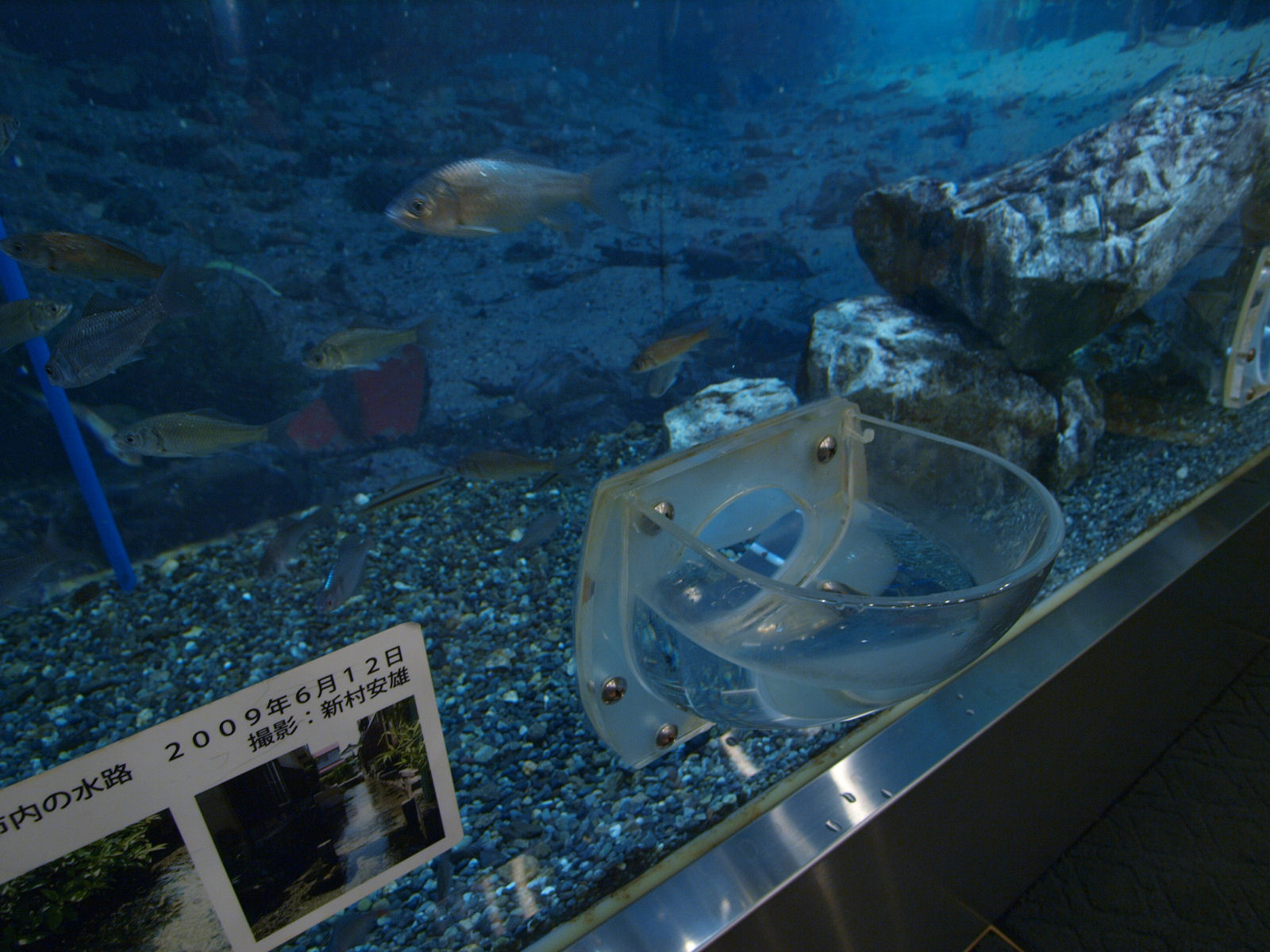 写真は琵琶湖博物館内の,魚に触れることができる水槽.