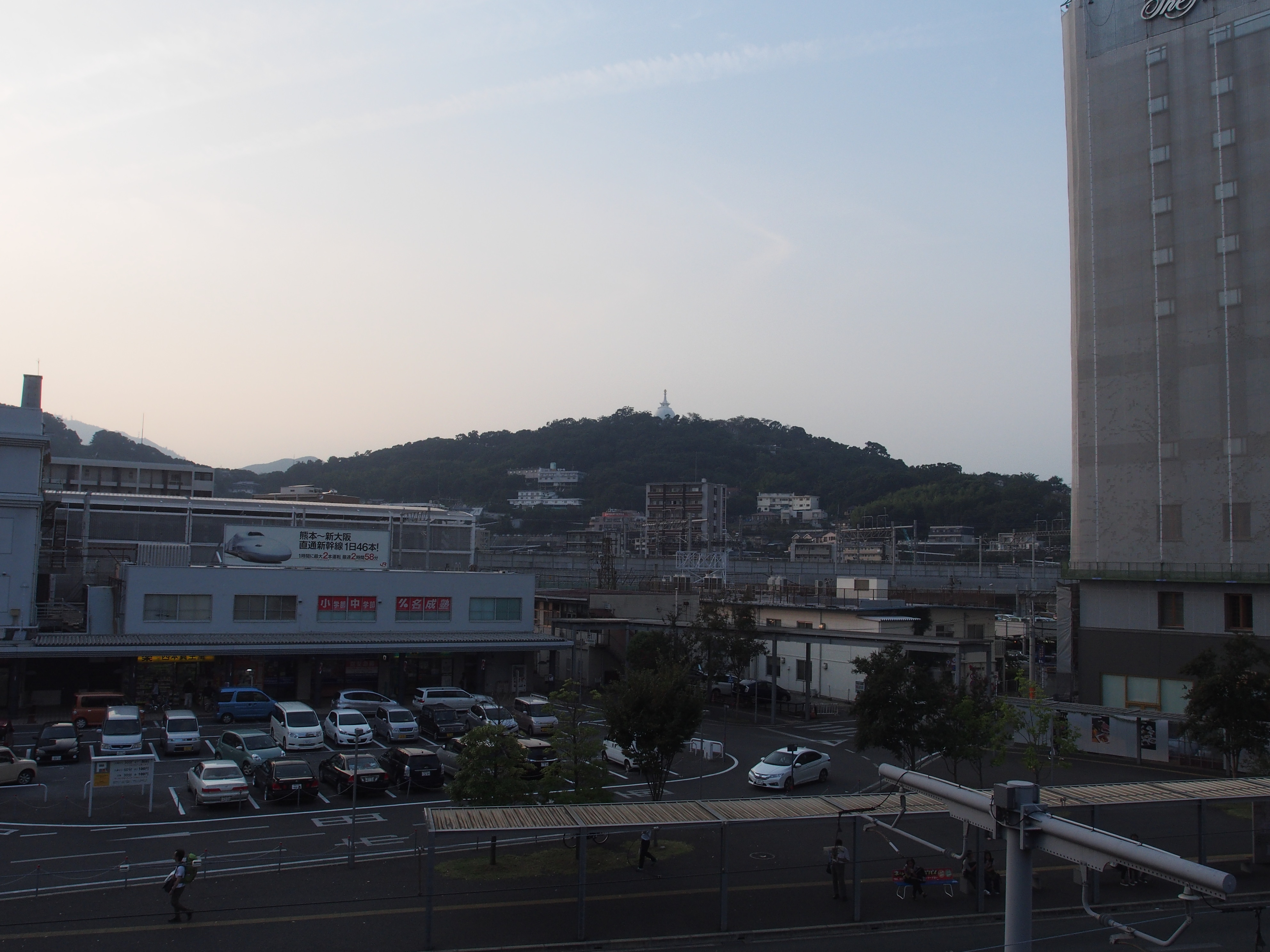 熊本駅付近の光景.白い建物の見える花岡山は,熊本の夜景が一番きれいに見えるといわれる場所だと後で知ったので,次に機会があれば見に行こうと思います.